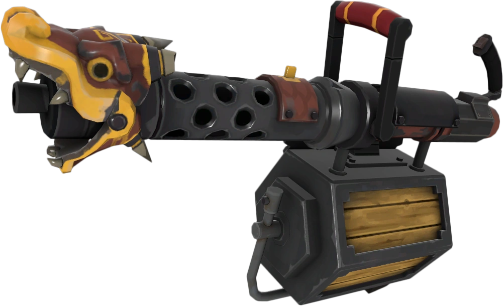 The Huo-Long Heater is a primary weapon for the Heavy. The name comes from the Chinese word for "fire dragon" (火龍, huǒlóng). It is an antique wooden machine gun with team-colored portions. A traditional Chinese dragon's head is mounted on the muzzle of the gun. This weapon has a ring of fire coming out of it while spun-up, even if not firing at the cost of 5 ammo drained a second while spun-up. This weapon does the same damage as the Minigun and the same firing speeds. This gun also chews up ammo much faster and is best used on maps with a lot of ammo packs of payload where you can get ammo when needed. Not many players end up using the weapon by the fact that it´s overshadowed by the Tomislav and Minigun.