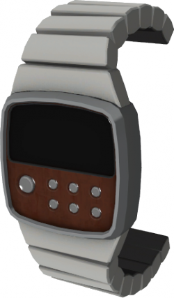 The Invisibility Watch, also known as the Invis Watch, is the default PDA weapon for the Spy. It is a piece of advanced technology embodied in a digital watch with a partially wooden face and a silver segmented wristband. This is activated on right click (default) or your special ability/attack key. The watch makes the user completely invisible to enemies. To allies, you look like a semi-transparet blue (or red) ghost. When bumped into, you look like how you do to your allies, except more solid. When attacked, the effect is the same but is longer or shorter depending on the damage inflicted. You cannot attack while cloaked. You can cloak for a maximum of 9.4 seconds, and when you run out of cloak the spy automatically puts away the watch and uncloaks. A dispenser can regenerate a spy's cloak while cloaked if the spy is Disguised. A level 1 dispenser makes the cloak never lose cloak if standing still, a level 2 makes it slowly regenerate, a level 3 makes it regenerate faster. The ammo crates are the same for the cloak bar as with the weapons. You can manually uncloak by using your right mouse button key again.