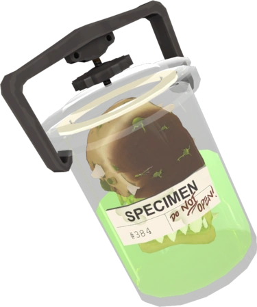 The Self-Aware Beauty Mark is a secondary weapon for the Sniper. It is a sealed jar containing translucent green fluid which sloshes inside the container as the player moves. There is a bread monster suspended inside it. A label on the jar reads "SPECIMEN; DO NOT OPEN" with the serial number of #384. The bread monster struggles and squirms inside the jar while growling.