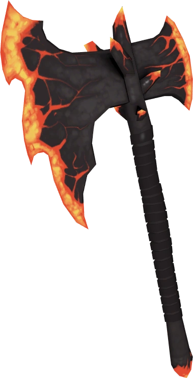 The Sharpened Volcano Fragment is a promotional melee weapon for the Pyro. It is an obsidian axe with glowing lava flowing along the blade's extreme edges. This axe does 20% less damage toward everything, so it does 44-60 damage (average 52 with critical hit of 156), but ignites the enemy on hit. This axe is not a very good weapon unless used in conjunction with a Scout wielding the Sun-on-a-Stick, as the Scout will deal 100% critical hits. This is not very good on maps with lots of ammo pickups, as the Pyro can just replenish his ammo quickly and come back and battle. The Afterburn with the damage of the weapon is 112, about 0.7 seconds of continuous Flamethrower fire if most of the flames hit the enemy, and the swing speed of the weapon is 0.8 seconds. With the damage penalty, this weapon is less suited for direct combat, and overall, the stock Fire Axe is a better choice of a weapon, as the stock Flamethrower is better at hit and run tactics than this weapon.